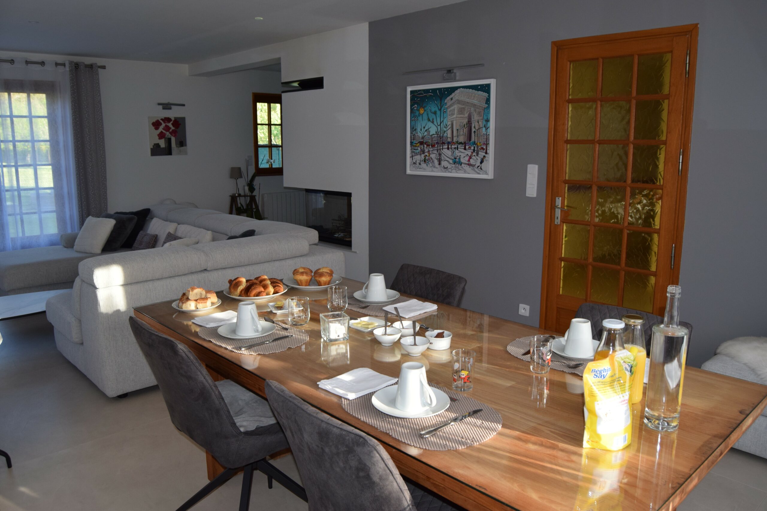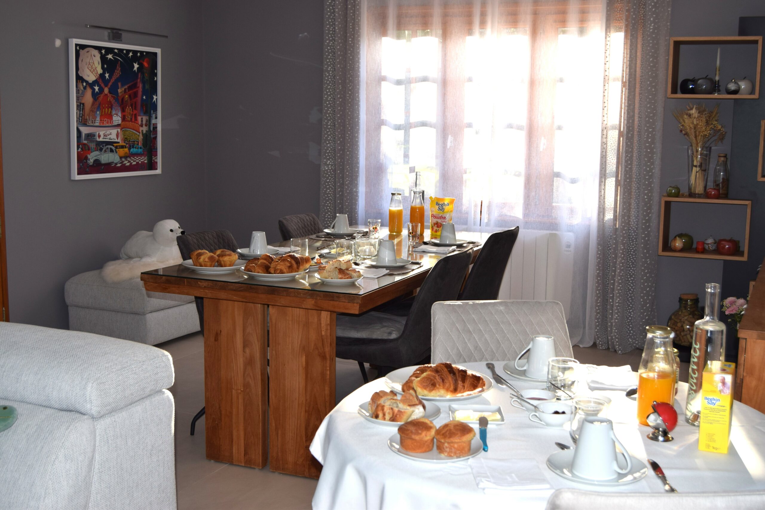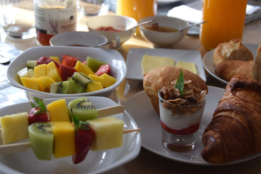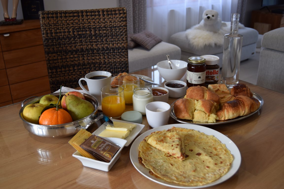 Pour commencer en douceur, vous trouverez déjà sur la table un verre de jus de fruits  (clémentine, ananas, ou parfois pomme). Côté boulangerie, nous sélectionnons le pain et une viennoiserie auprès de notre excellente boulangerie locale.